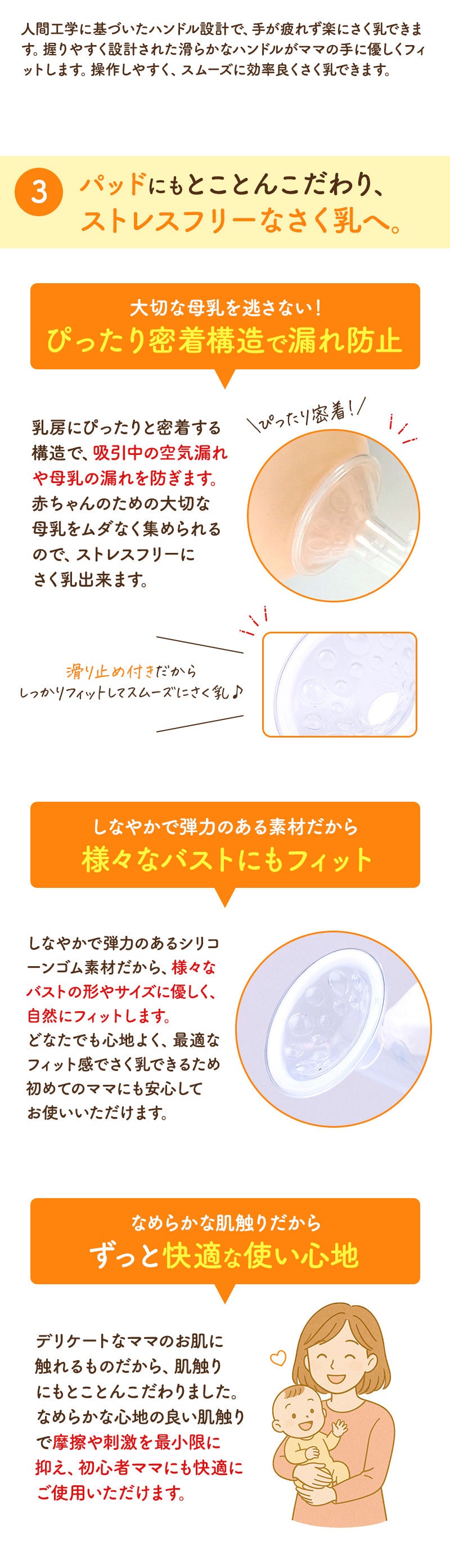 【抜群の吸引力】優しい肌触りのシリコンパッドが肌に密着、しっかり搾乳して漏れません。