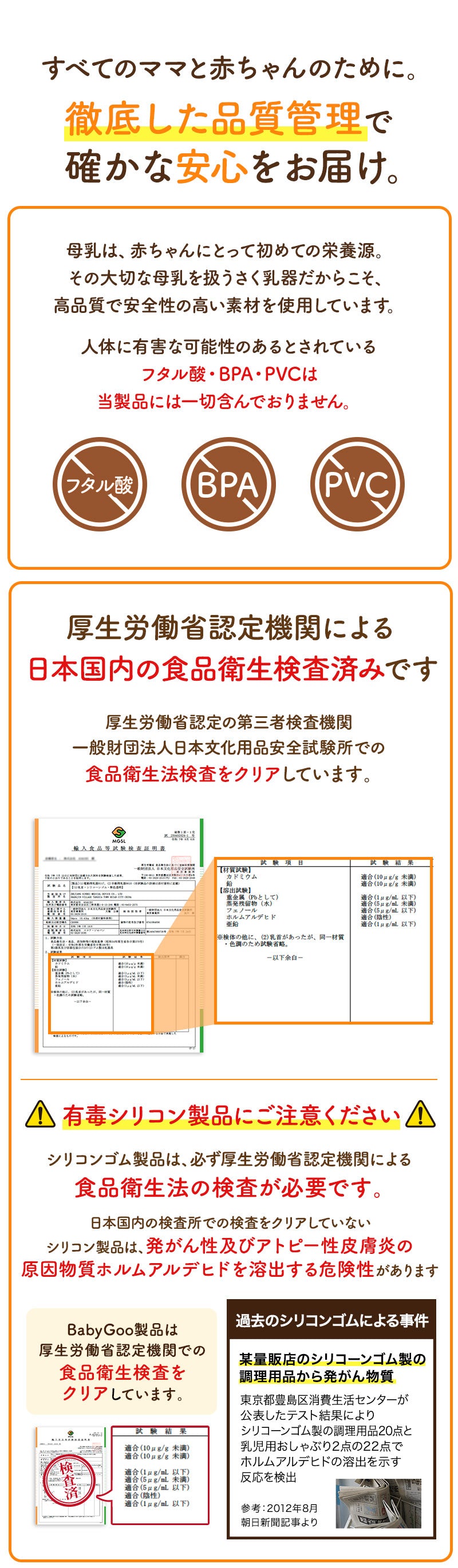 【確かな安全品質】BPAフリー・フタル酸フリー・食品衛生法適合検査クリア済み。赤ちゃんに使うものだから、安心してご使用いただける品質をお約束します。