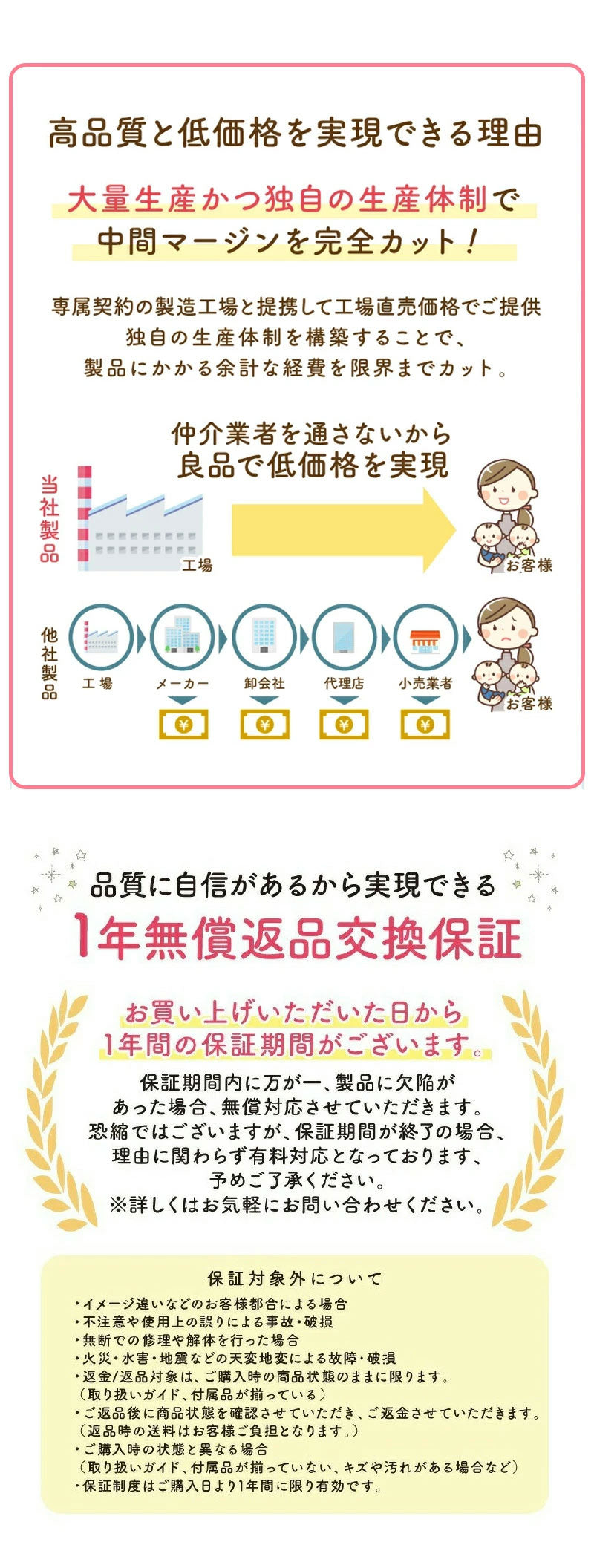 【安心の1年保証】製品に関する問題や不具合が生じた場合には、ご購入から365日以内であれば、返品・交換などの対応をさせていただきます。(保証詳細ににつきましては保証書が同梱されておりますので、ご確認ください。)