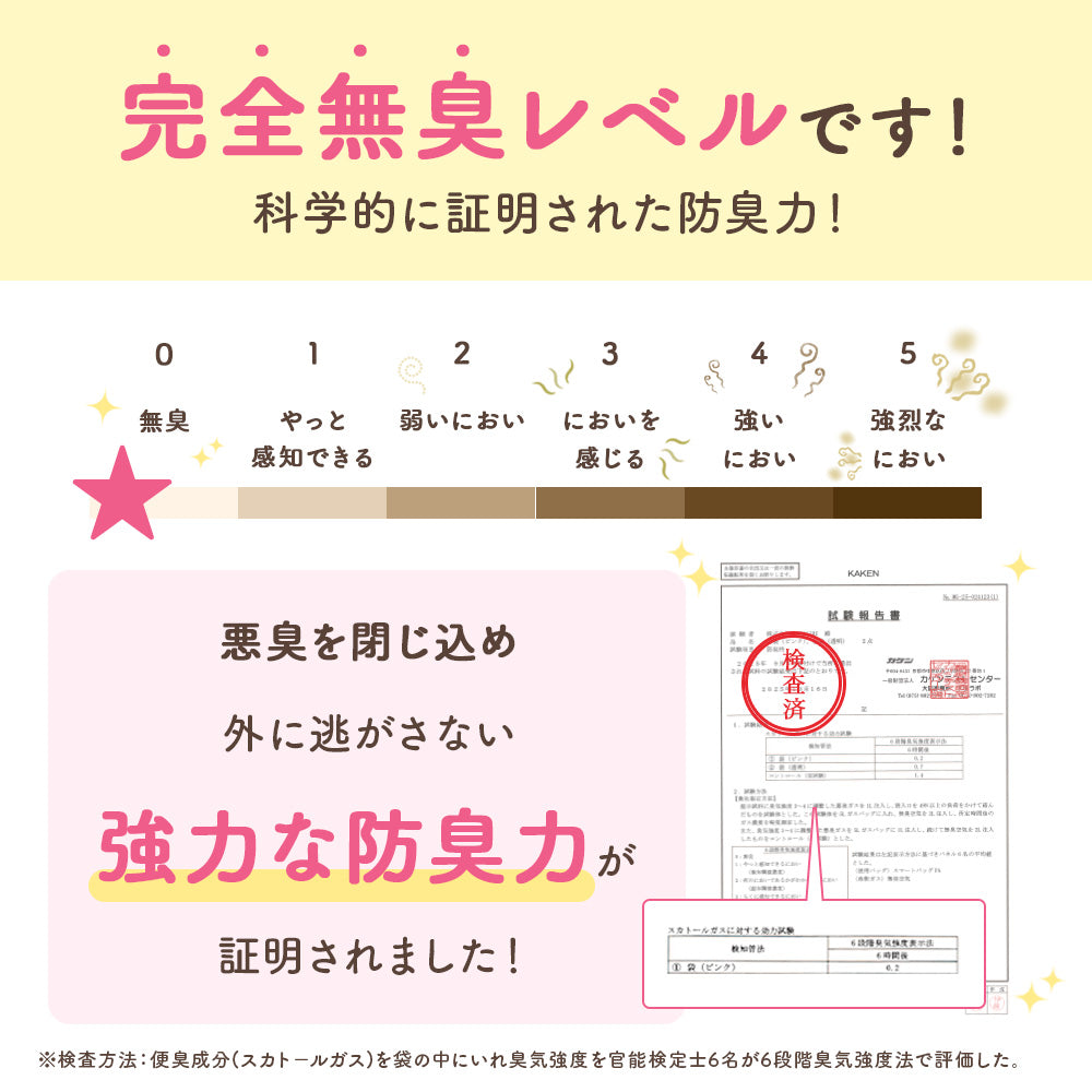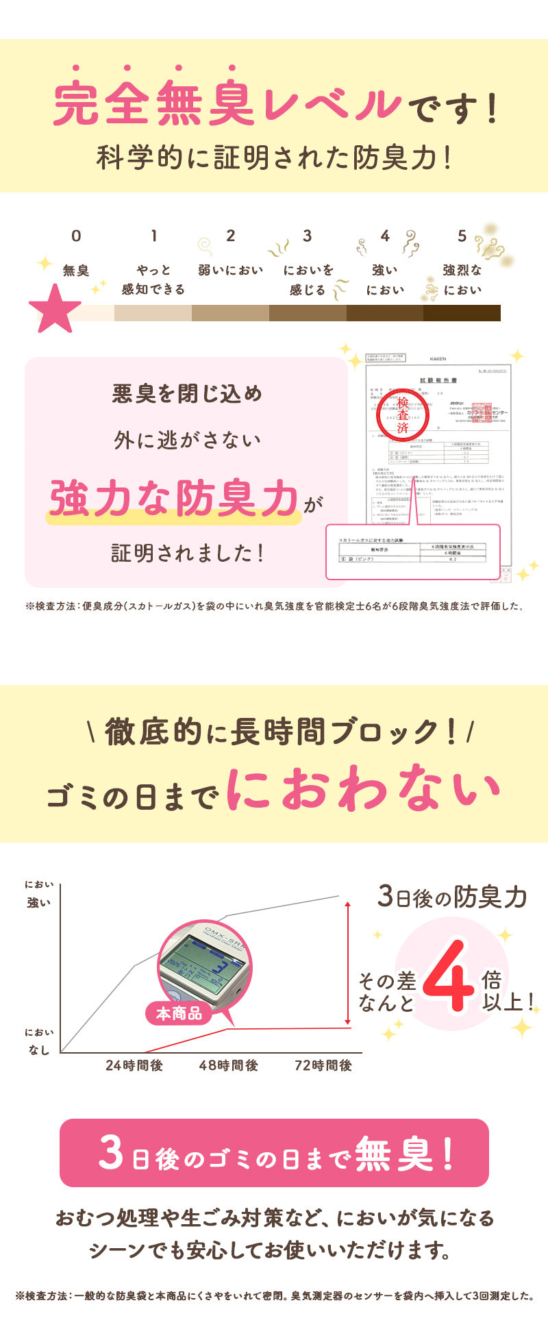 おむつの防臭袋は、厳しい検査をクリアした本気の防臭袋。科学的に証明された確かな防臭性能で、安心してお使いいただけます。