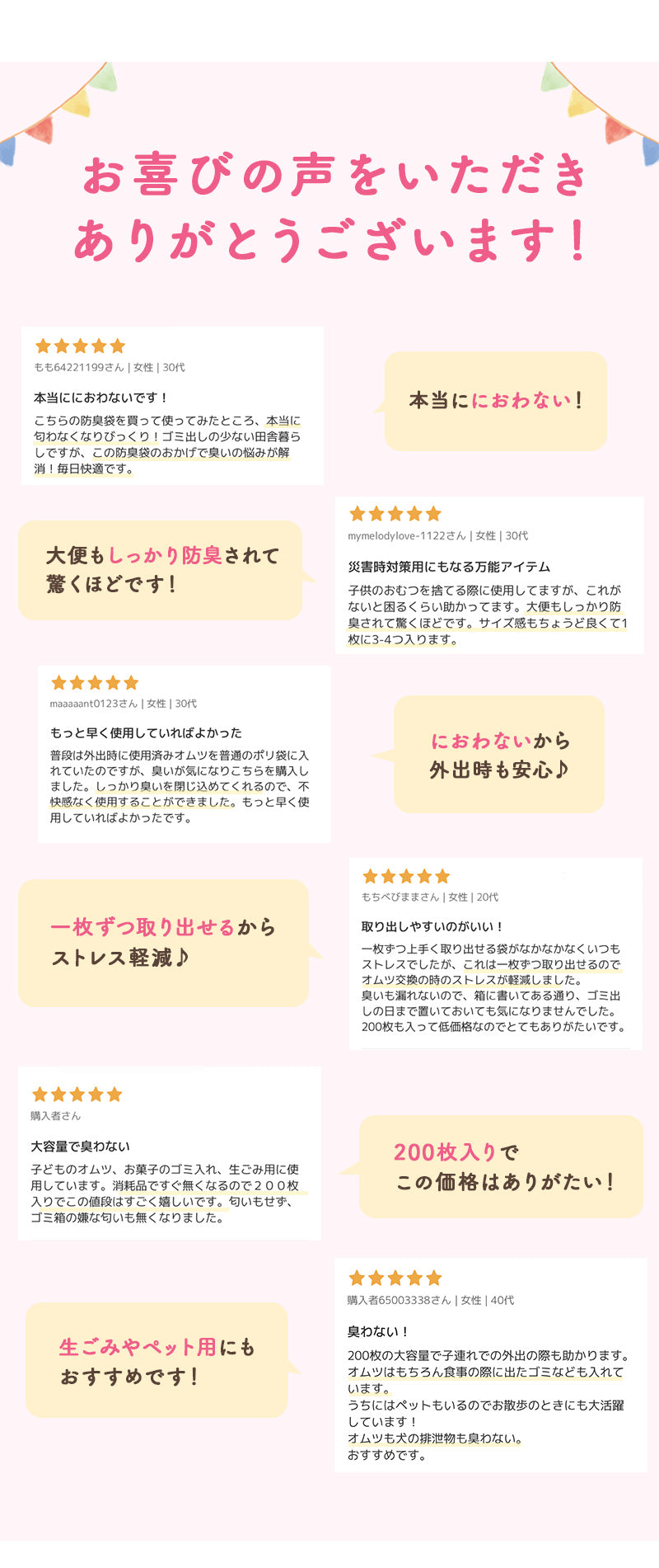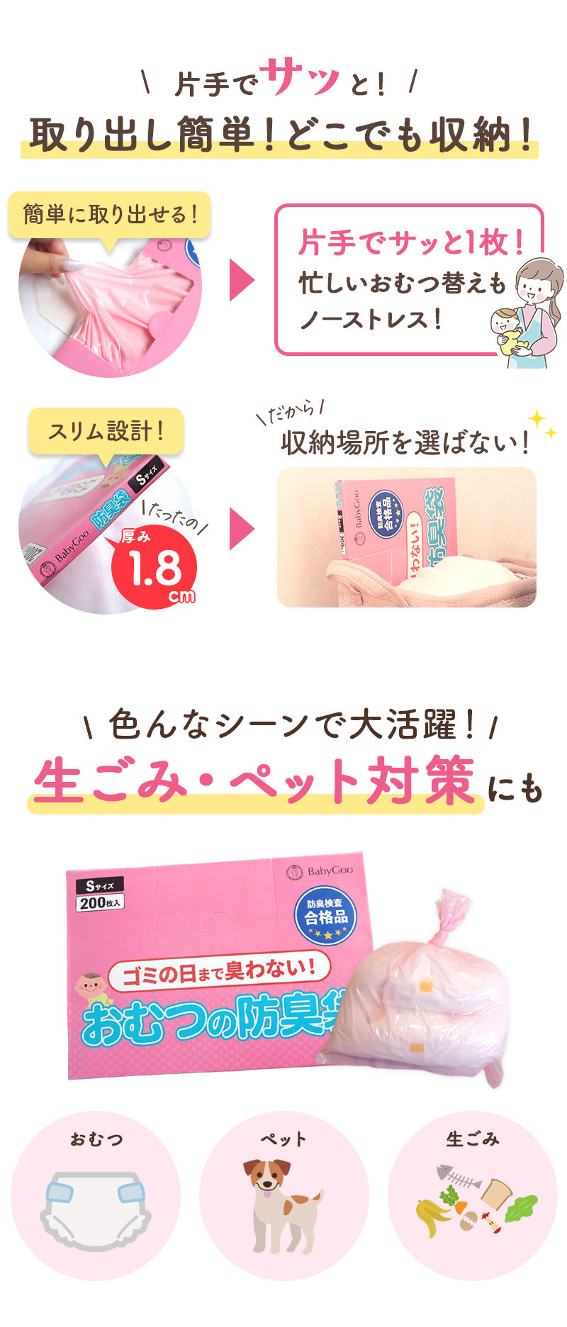 おむつ、生ごみ、ペットの排泄物など、ニオイが気になるものを丸ごと封じ込めます。見えない臭いも徹底ガード!おむつの防臭袋があれば、もうニオイの心配はいりません。